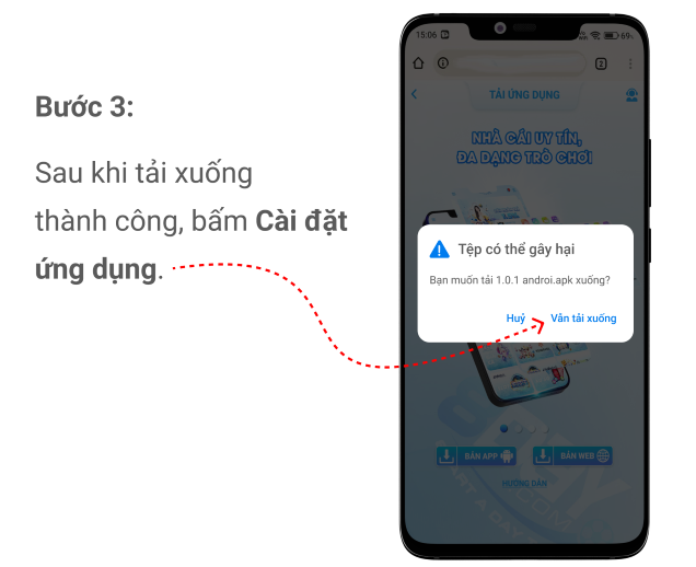 Buóc 3: Sau khi tải xuống thành công,bấm cài đặt ứng dụng