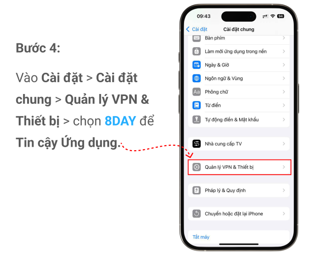 Buóc 4:Vào Cài đặt > Cài đặt chung > Quảu lý VPN & thiết bị > chọn 8day đế Tin cậy ứng dụng